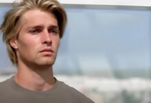 Moriah Plath in a red and black floral top, smiling for a selfie with a beach in the background.